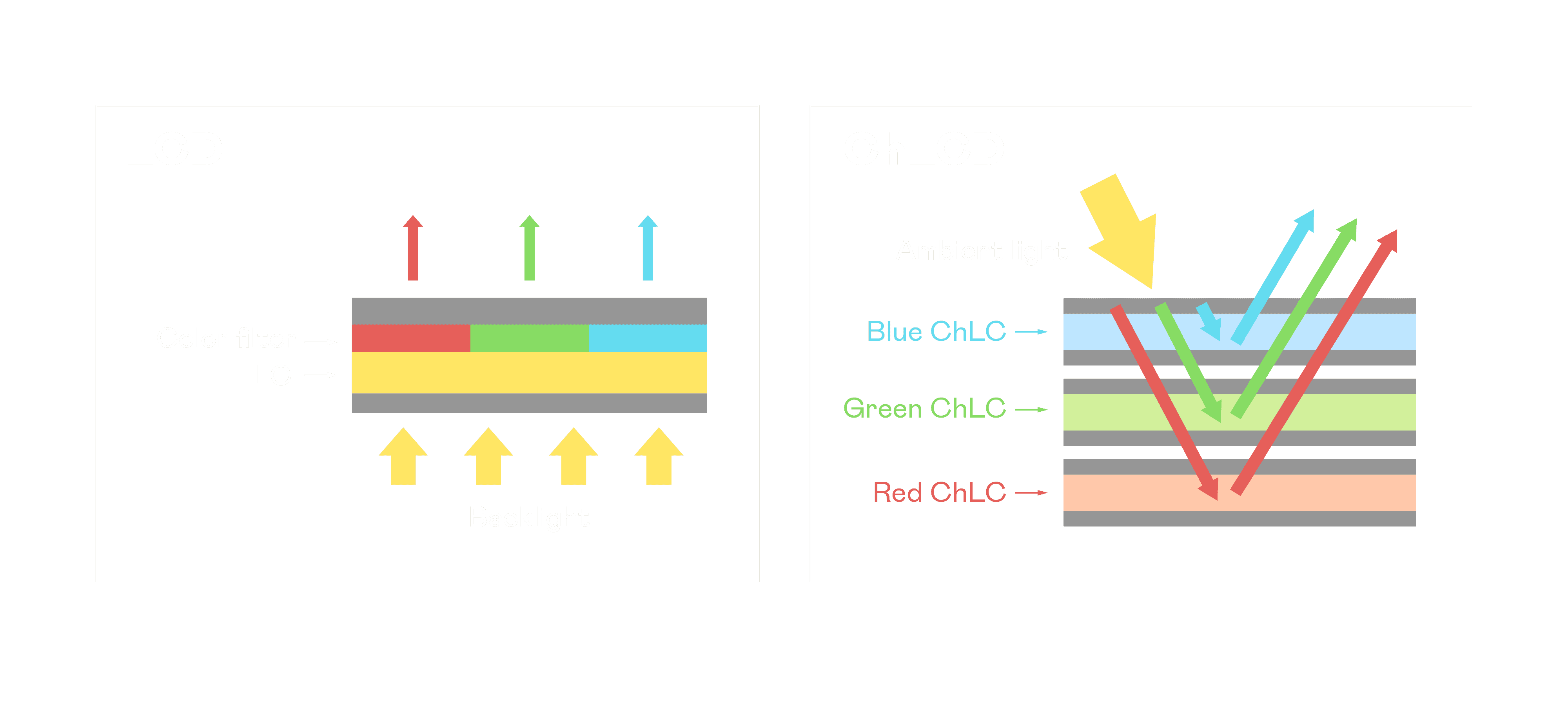 森林舞会胆固醇液晶显示器是由红、、、绿、、、、蓝三层胆固醇液晶面板堆叠而成,,,并采用无彩色滤光片设计,,,,减少环境光在反射过程中的损耗。。。。