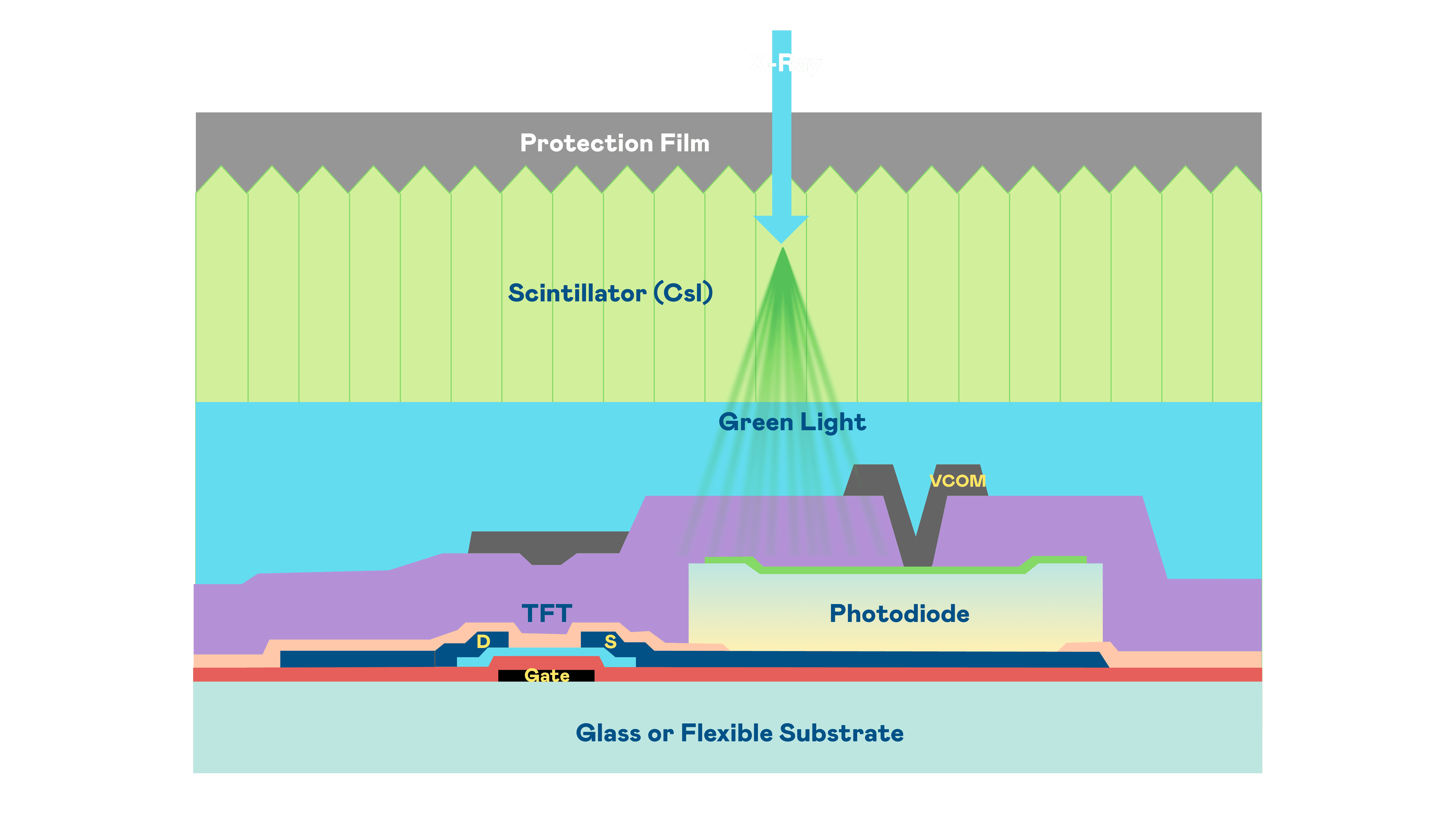 森林舞会的X光影像感测阵列使用薄膜电晶体 (TFT) 作为每个像素的读取开关,,,搭配光电二极体(Photodiode)的光电转换元件,,,,用以感测X光影像讯号。。